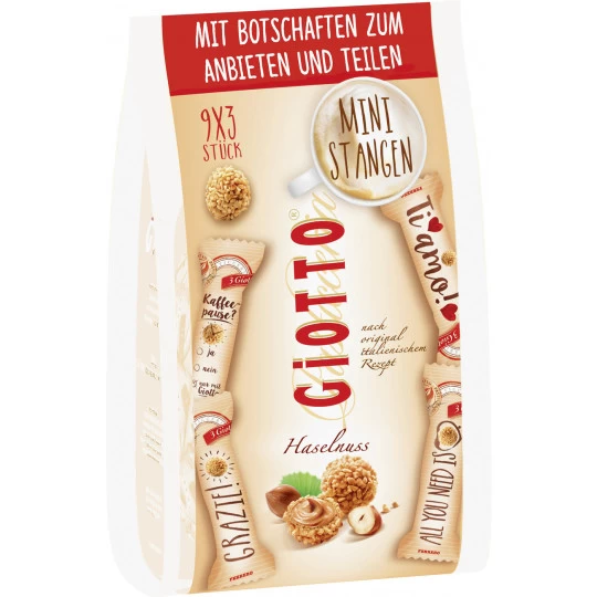 Ganz gleich, wann oder mit wem Sie GiOTTO genießen: Die kleinen Dreierstangen aus dem praktischen Beutel eignen sich besonders gut zum Anbieten und Teilen beim gemeinsamen Kaffee mit Freunden. Oder aber einfach für unterwegs zum Mitnehmen, für einen leckeren Genuss zwischendurch.